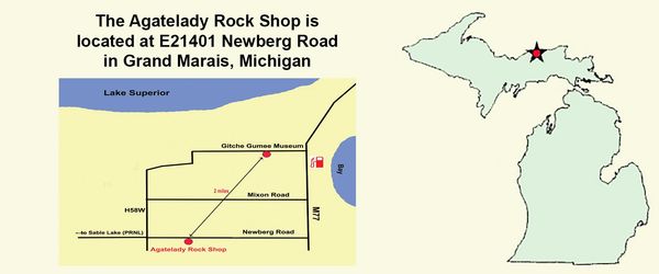 The new Agatelady Rock Shop is located on Newberg Road two miles southwest of the original Gitche Gumee Museum and downtown Grand Marais. Please note that GPS systems do not work well in our area. If you wish to use GPS, insert the crossroad of M77 and Newberg Road. From that intersection drive 3/4 of a mile west on Newberg Road, and look for the rock shop's sign at the bottom of my driveway on your left. Please note that east of M77, the road's name is instead Carpenter Road.