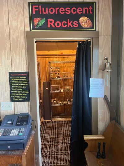 The antiques in the rock shop's west addition are gone and now a wide array of fluorescent rocks are in this room. The long wave 365 nm fluorescent rocks include syenite (the "Y" rock), ruby, fluorite, agate, sodalite, and more. The short wave 255 nm rocks include willamite, calcite, agates, and more. We also have a wide array of UV flashlights available including long wave, mid wave, and short wave.